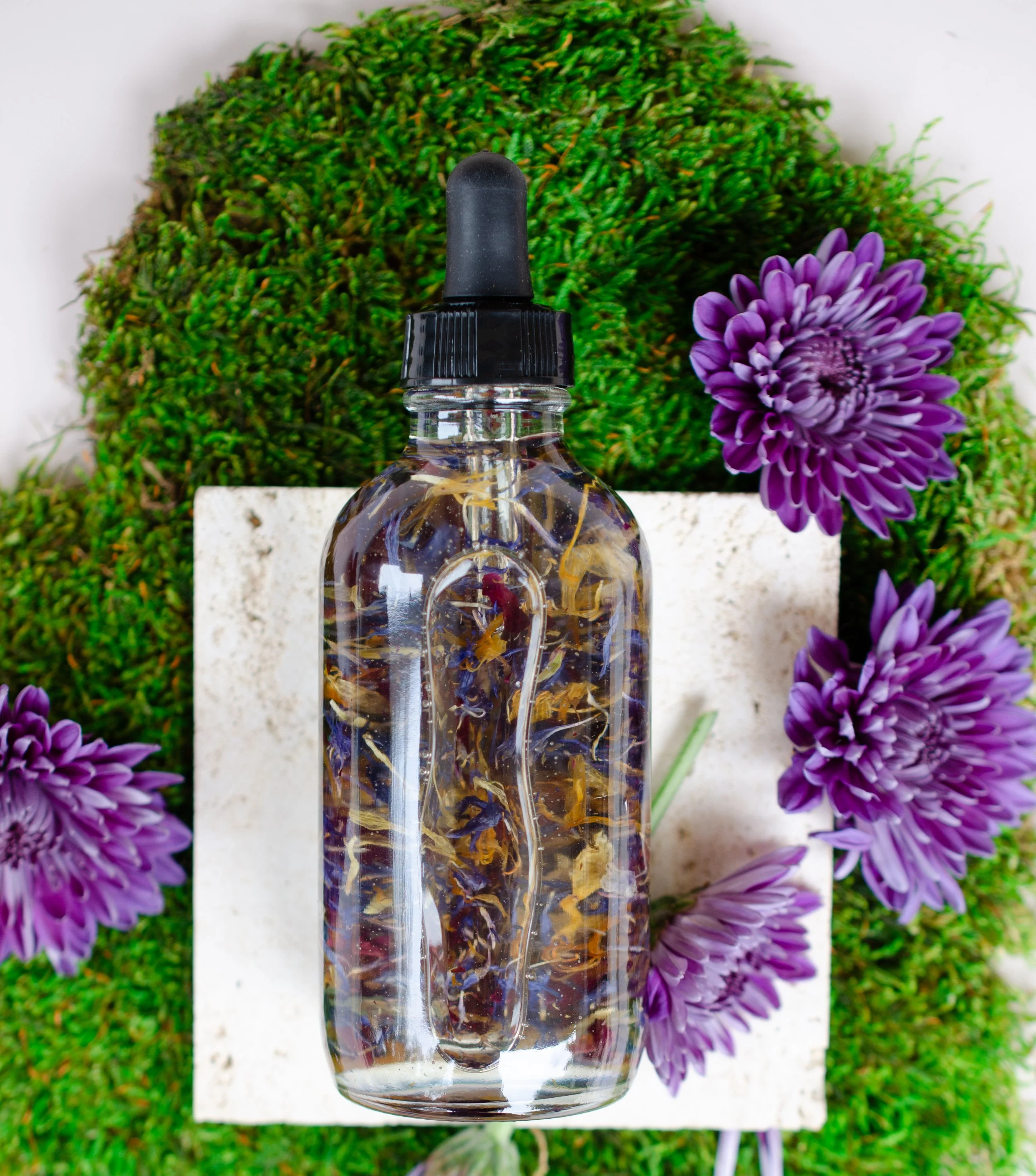 A metal container filled with dried flower petals, surrounded by fresh pink, purple, and peach flowers on a white surface.